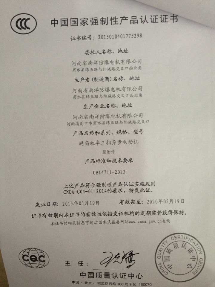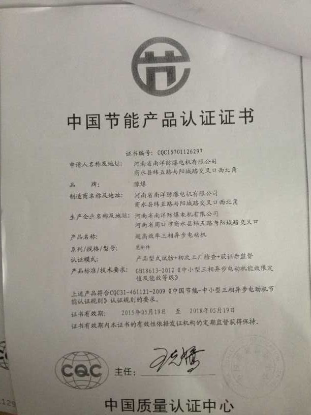 在2015年5月19日的這一天,對于河南省南洋防爆電機有限公司來說是值得慶祝的一天。因為就在這一天公司獲得了YE3系列超高效率隔爆型電動機的雙重產(chǎn)品認證證書。也就是說在這一天河南省南洋防爆電機有限公司可以投入YE3超高效率隔爆型電動機的生產(chǎn)了。至此普天同慶的時刻,河南省南洋防爆電機有限公司董事長王科偉先生代表公司對做出這一貢獻的廣大同仁表示慰問和感謝。