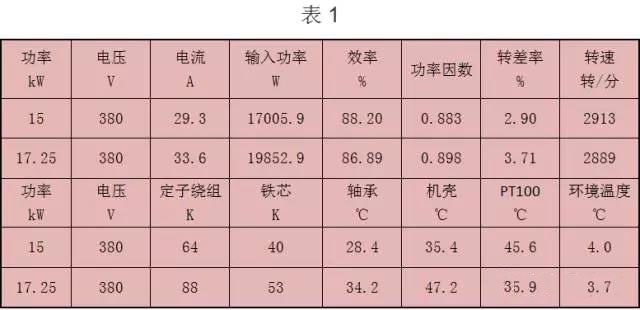 從表中數(shù)據(jù)可以看出,定子繞組溫升、軸承溫度、機殼溫度都有明顯的升高。有的電機廠家做型式試驗時只按照標準電機進行試驗,不能準確判斷電機在其他服務(wù)系數(shù)狀況下的性能指標。